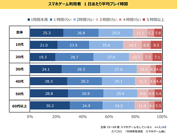 スマホゲーム利用者3,143人に「1日あたりのプレイ時間」を聞くと、「1時間未満」25.3%、「1時間くらい」26.8%、「2時間くらい」25.9%、「3時間くらい」11.1%、「4時間くらい」5.2%、「5時間以上」5.8%となった。年代別だと、やや若年層のほうが長めだが、プレイ経験ほど顕著な差はなかった。
