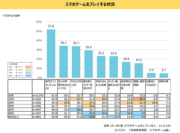 「ふだんどんなときにスマホゲームをするか」を聞くと、「自宅でくつろいでいるとき」51.8%、「空いた時間があればいつでも」34.2%、「やることがないとき」33.7%、「寝る前にベッド・布団のなかで」29.3%、「休日のまとまった余暇」23.2%が上位だった。「通勤・通学時間」は全体では15.5%と低いが、年代別では10代で28.4%に達しており、高年層は“娯楽”、若年層は“ひまつぶし”といった傾向差が見られる。