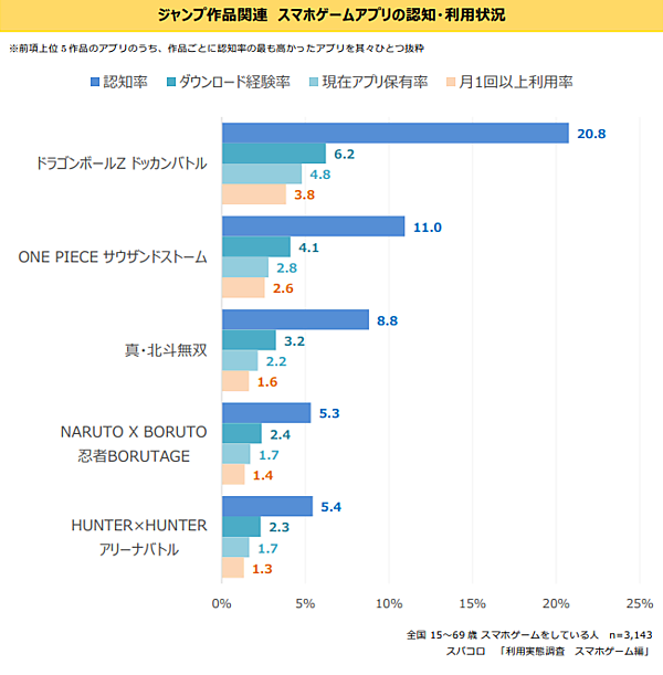 上位5作品「ドラゴンボール」「ONE PIECE」「北斗の拳」「NARUTO」「HUNTER×HUNTER」を題材とするゲームアプリについて、知っているか・プレイ経験があるかを聞くと「ドラゴンボールZドッカンバトル」(認知率20.8%、利用経験率6.2%、現在アプリ保有率4.8%、月1回以上アプリ利用率3.8%)が1位で、「ONE PIECEサウザンドストーム」(認知率11.0%、利用経験率4.1%、現在アプリ保有率2.8%、月1回以上アプリ利用率2.6%)がそれに続くなど、作品自体の認知率とゲームの認知率は同じ順だった。