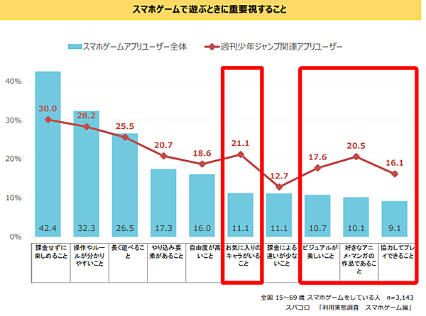 これを週刊少年ジャンプ関連アプリユーザーに限ると、これらの項目は平均より低かった。一方で、「お気に入りのキャラがいること」は平均11.1%に対しジャンプアプリユーザーだと21.1%が重視していた。そのほか「ビジュアルが美しいこと」「好きなアニメ・マンガの作品であること」「協力してプレイできること」も平均より重視していた。キャラクターやビジュアルは作品そのものだが、キャラの関係性にも関わる“協力プレイ”もファンの女性にとって大切な部分と推察される。