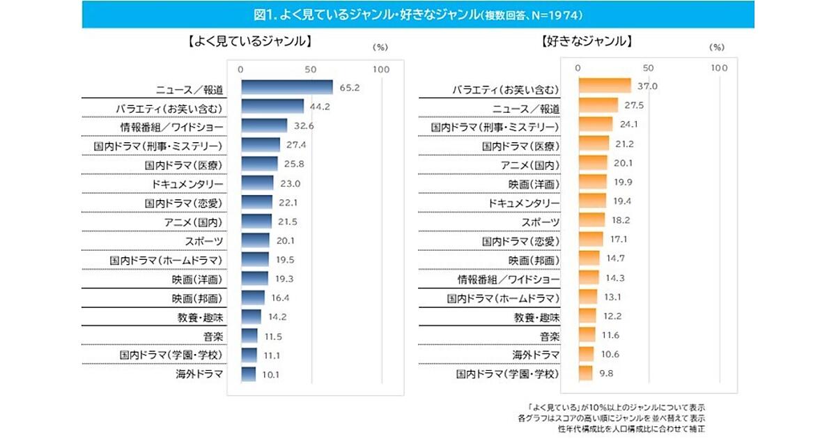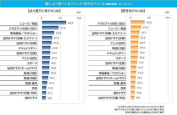 まずテレビ視聴で「よく見ているジャンル」と「好きなジャンル」を聞くと、よく見ているのは「ニュース/報道」65.2%が最多で、「バラエティ(お笑い含む)」44.2%、「情報番組/ワイドショー」32.6%が続いた。一方好きなジャンルは「バラエティ(お笑い含む)」37.0%で、「ニュース/報道」27.5%を上回った。それに「国内ドラマ(刑事・ミステリー)」24.1%が続く。