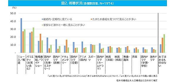 逆に継続視聴が不必要な「情報番組/ワイドショー」「ドキュメンタリー」は「たまたま」が相対的に高い。誰かといっしょに見ることが多いジャンルは「ニュース/報道」「バラエティ」だった。また「あてはまらない」との回答が「家族など誰かと一緒に見る」は2割を超えており、特定ジャンルとの親和性はよくない。