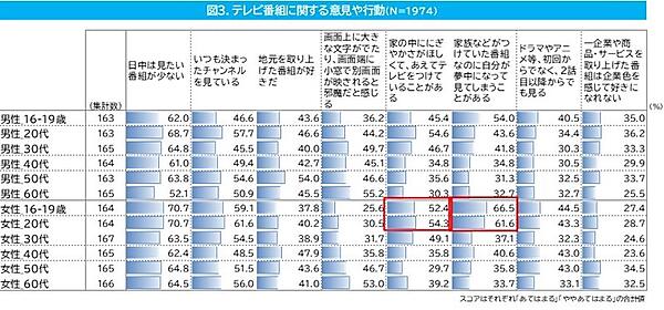 最後に、「テレビ番組に対する意見や行動」を性年代別に見ると、10代・20代女性の行動パターンが比較的偏っており、「日中は見たい番組が少ない」「いつも決まったチャンネルを見ている」「家の中ににぎやかさが欲しくて、あえてテレビをつけていることがある」「家族などがつけていた番組なのに、自分が夢中になって見てしまうことがある」という意見が他より多かった。「いつも決まったチャンネルを見ている」は20代男性も多い。
