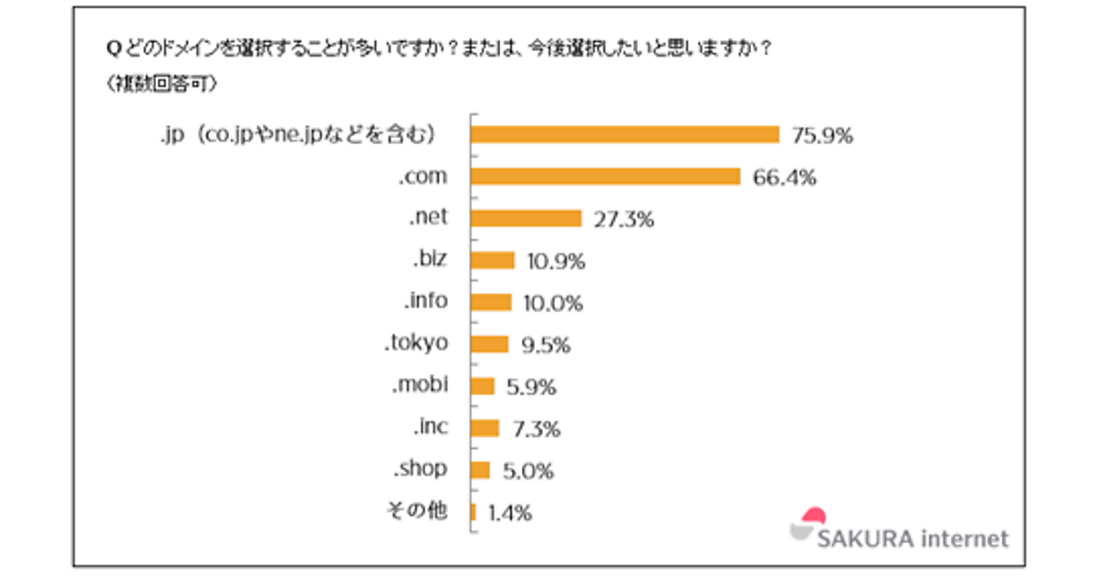 まず「どのドメインを選択することが多いか/今後選択したいか」を聞くと、1位は「.jp(co.jpなど含む)」75.9%で、「.com」66.4%がそれに続き、やや離れて「.net」27.3%が3位だった。