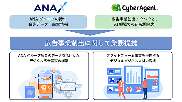 ANAグループは、新型コロナウイルスの感染拡大に伴う航空旅客需要の減少を受け、事業構造の改革を推進。グループの非航空事業収入の新たな柱としてオンラインとオフラインを組み合わせた広告事業の展開を目指す。サイバーエージェントは、ANAグループのデータを生かしたデジタル広告配信事業の確立を支援し、人材交流を通してANAグループ内の中核人材を育てる。