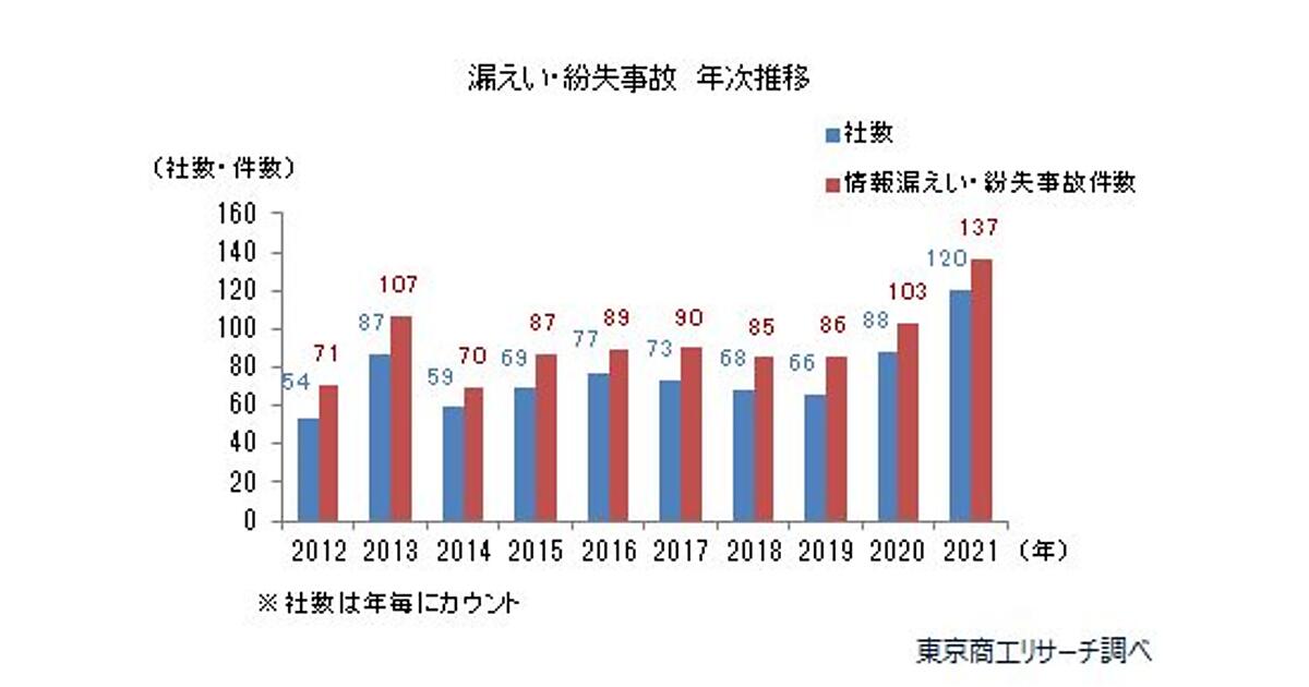 東京商工リサーチは、2021年における個人情報漏えい・紛失事故の集計結果を発表した。上場企業およびその子会社で個人情報の漏えい・紛失事故を公表したのは120社・137件、漏えいした個人情報は574万9,773人分だった。これは調査を開始した2012年以降で、いずれも最多記録だという。