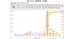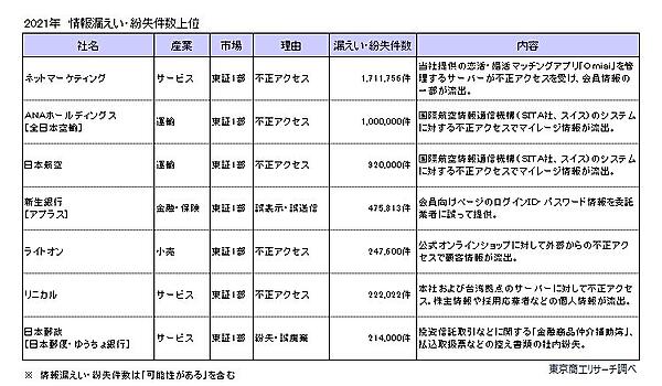 2012年~2021年での累計は496社・925件で、全上場企業(約3,800社)の1割以上を占めている。漏えい・紛失した可能性のある個人情報は累計1億1,979万人分に達したが、日本の総人口は1億2,534万人でほぼそれに相当する数字となっている(総務省統計局の発表による。2022年2月1日現在)。