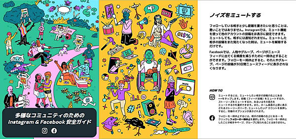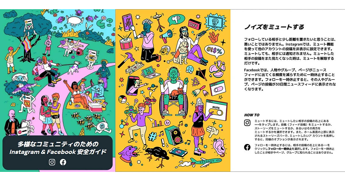 多様なコミュニティのためのInstagram & Facebook安全ガイドでは、SNSとの正しい付き合い方を学ぶ際に知っておきたい機能を紹介。誹謗(ひぼう)中傷を目的にするコメントやダイレクトメッセージから守る「抑制機能」のように旧ガイド後に導入したツールや、Instagram、Facebookの利用時間を管理する機能などを新たに取り上げた。イラストも一新した。
