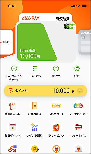au PAYは、会員数が約2830万で、481万カ所のポイント・決済加盟店で利用可能。実店舗でのQRやバーコード決済、請求書払い、ネットショッピングのオンライン決済に対応する。Suica、は自動改札機にタッチするだけで通過でき、全国10の交通系ICカードとの相互利用が可能。モバイルSuicaは定期券やSuicaグリーン券をスマホで購入できる。