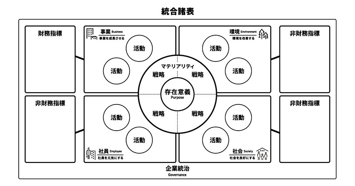 統合諸表は、企業が描きたい中長期的な価値創造を可視化して、あらゆるステークホルダーが理解して共感でき、社内外でのコンセンサス(合意)を得やすい設計図として開発した。企業価値を「事業」「社員」「社会」「環境」の4象限で捉えて、財務情報だけでなく非財務情報も含めて統合的な視点で企業価値の可視化・再構築を可能にした。