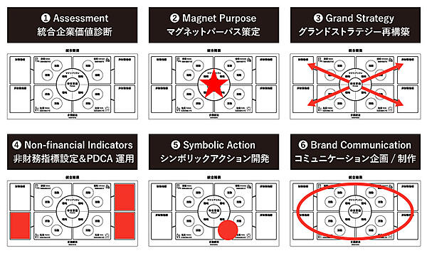 支援ソリューションでは①統合諸表による統合企業価値診断②求心力あるマグネットパーパス策定③事業、社員、社会、環境の棚卸しとグランドストラテジー再構築④開示する非財務指標の設定とPDCAサイクル運用⑤価値創造ストーリーを実践する具体的アクション開発⑥無形価値を伝達するブランドコミュニケーションの企画・制作・実施――を行う。