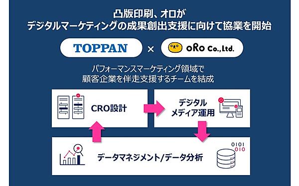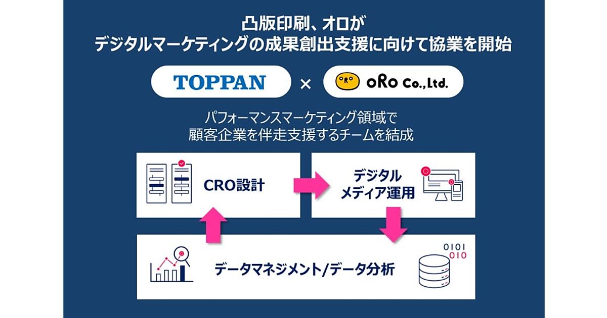 凸版印刷は、デジタルマーケティング分野で戦略策定から実行支援まで幅広くサービスを提供。オロは、デジタルメディアに来訪したユーザーがコンバージョン(最終成果)に至る確率を高める情報設計やクリエイティブ関連施策の「CRO(Conversion Rate Optimization=コンバージョン最適化)」に強みがある。パフォーマンスマーケティング領域で両社の知見を融合して、顧客企業に成果創出に向けた最適なサービスを提供する。