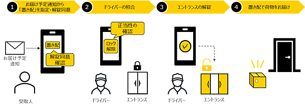 ヤマト運輸は、オートロック付きマンションでも、玄関前など指定場所に非対面で荷物を届ける「置き配」を可能にした、と3月28日発表した。複数のデジタルキーが一括管理できるシステム「マルチデジタルキープラットフォーム」を開発し、デジタルキー提供6社と連携契約を締結。デジタルキーでマンション入口を解錠する機能をドライバーの端末に同日加えた。
