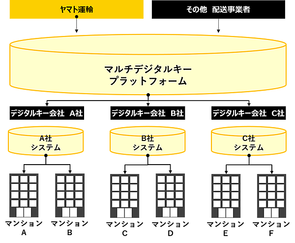 デジタルキー提供会社は、同プラットフォームとAPI連携することで導入が可能。ヤマト運輸と連携するオンラインショップで注文した商品の受け取り場所が指定できるサービス「EAZY」の荷物が対象。EAZYを配達するドライバーの端末にオートロック解錠機能を追加した。今後は自動車のトランクへの置き配などデジタルキーを生かした新たな受け取り方法を検討する。