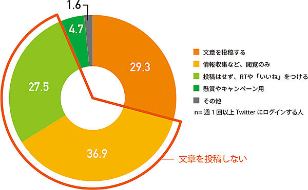 まず調査対象(週1回以上Twitterにログインする人)に、Twitterの使い方を聞くと、「文章を投稿する」29.3%、「情報収集など、閲覧のみ」36.9%、「投稿はせず、RTやいいねをつける」27.5%、「懸賞やキャンペーン用」4.7%、「その他」1.6%だった。文章を投稿しないユーザーが6割を超えている。