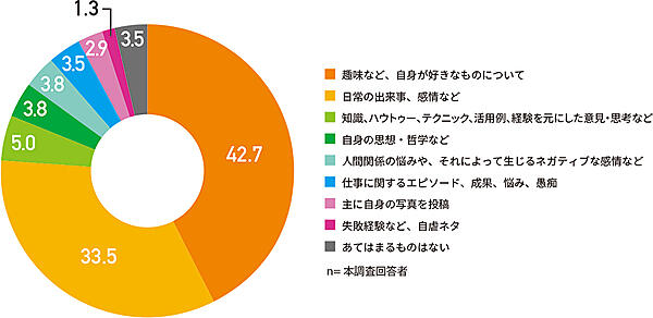 次に、Twitterの主な使い方が「文章の投稿」とした人に、「ふだんTwitterに投稿する話題の傾向」を聞くと、「趣味など、自身が好きなものについて」42.7%、「日常の出来事、感情など」33.5%の2つが特に多く、合わせて7割を超える。その他には「知識、ハウツー」「自身の思想・哲学」「人間関係の悩み」「仕事のエピソード」「写真」「自虐ネタ」といった意見が並ぶ。