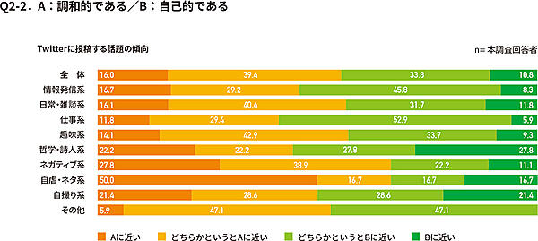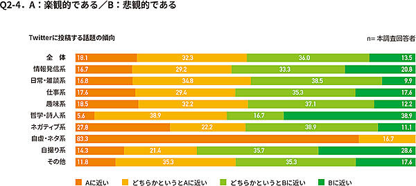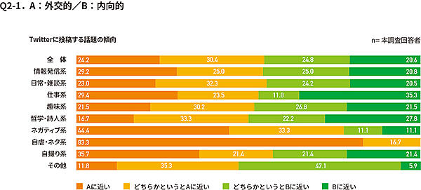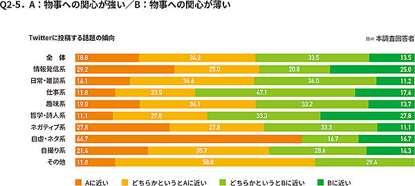 「日常・雑談系」「趣味系」以外はサンプルサイズが小さいため参考値だが、たとえば「ネガティブ系」「自虐・ネタ系」の人は自身を「外交的」「楽観的」と考えている人が目立つ。また「情報発信系」は「物事への関心が強い」と考えている人が多かった。