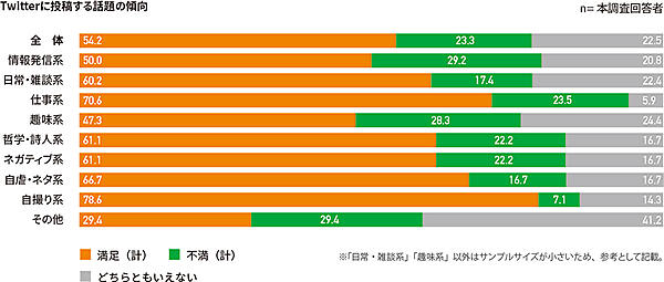最後に「生活への満足度」を聞くと、「日常・雑談系」の投稿をする人は生活への満足度が高く、「趣味系」の投稿をする人は、満足度が低い傾向が見られたという。