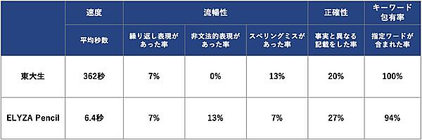 ELYZA Pencilと東大の学生3人を比べた文章生成検証では、作業時間はELYZA Pencilが東大生の56分の1、流ちょう性はほぼ同水準、事実と異なる記載の率はELYZA Pencilが27%、東大生20%だった。ELYZA Pencilは、AIが一から文章を作成する生成型と呼ばれる国内では成功例が少ない技術を使っている。今後AIを改善して言葉を扱うホワイトカラーの生産性向上につなげる。