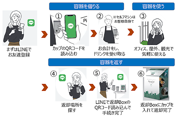 画面で「容器を借りる」をタップし、リユースカップのQRコードを読み取ってリユースカップでドリンクを受け取る。返却する時は、Re&GoのLINEアカウントから店舗を検索し、「容器を返却」をタップして店頭設置の返却BOXのQRコードを読み取った後、返却BOXに入れる仕組み。Re&Goは実証実験で利用者や店舗のニーズ、ビジネスモデルを調べ、2022年中の事業化を目指している。