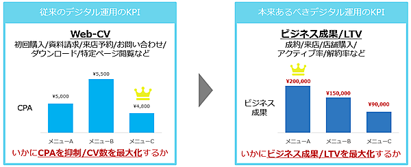 デジタル運用型広告は「Webコンバージョン最大化/CPA(顧客獲得単価)抑制」を目指すのが一般的だが、「広告最適化エンジン(広告AI)」は学習データの質で大きく最適化の精度が変わる課題があった。このため分析ツールの「Googleアナリティクス」などによるWebサイト行動データと、企業が保有する1st PartyデータからLTV(顧客生涯価値)や成約、来店などのビジネス指標を学習し、汎用的なビジネス成果予測モデルを構築する。