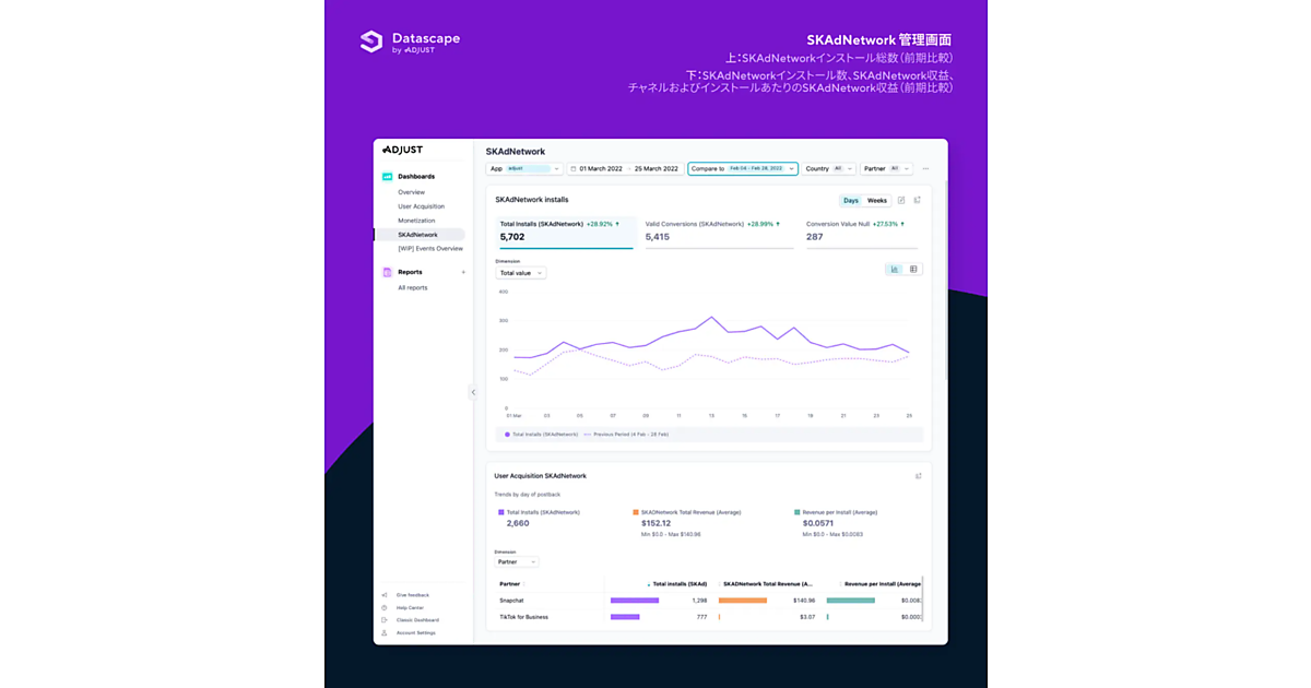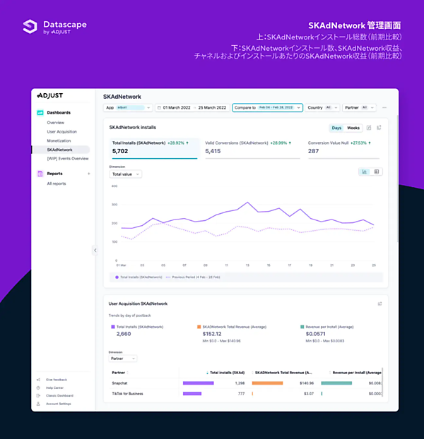 Datascapeは、最新技術を詰め込んだアナリティクスツールで、さまざまなデータをより簡単に視覚化する。マーケティング指標を瞬時に確認し、より深く詳細なデータを取得する。「iOS」と「Android」の両OSを横断してアプリパフォーマンスを比較し、米国Appleの広告測定の仕組みの「SKAdNetwork」の管理画面では、最もインストールやコンバージョンイベントを促したキャンペーンを把握できる。