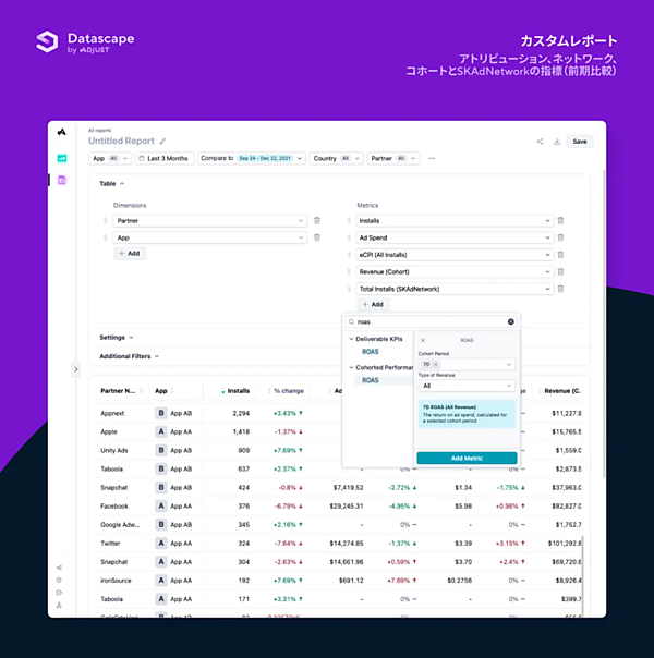 ネットワーク▽アトリビューション(貢献度評価)▽SKAdNetwork▽Appleのプライバシー保護フレームワークのATT(AppTrackingTransparency)のデータを1つのビューに並べ、さまざまな組み合わせで表示する。多数のパートナー連携とデータソースによって利益と収益の指標を可視化する収益管理画面もある。複数のキャンペーンの成果を表示して分析したいモバイルアプリマーケターのニーズに応えた。