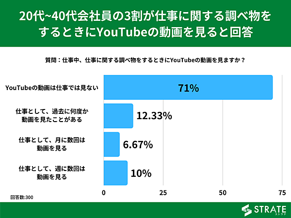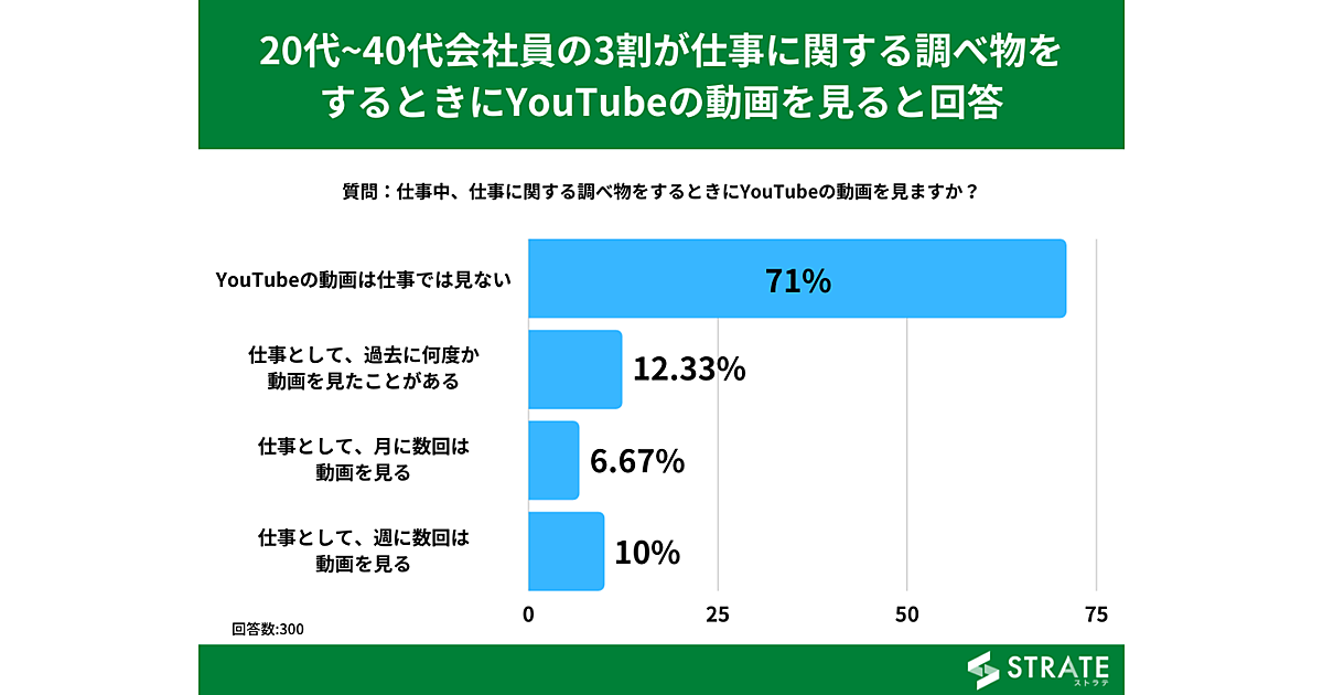 SheepDogが運営する「STRATE」は、YouTubeの仕事利用に関する調査結果を発表した。全国の20歳~49歳の男女正社員300人が回答している。