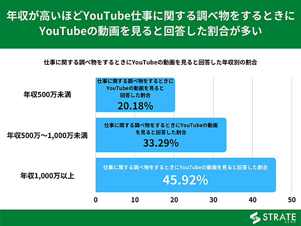 さらに年収別で見ると、年収1,000万以上がもっとも多く45.92%、次いで年収500万~1,000万未満の33.29%、年収500万円未満が20.18%となり、年収が高いほど仕事に関する調べ物でYouTubeの動画を見ると回答した割合が高かった。