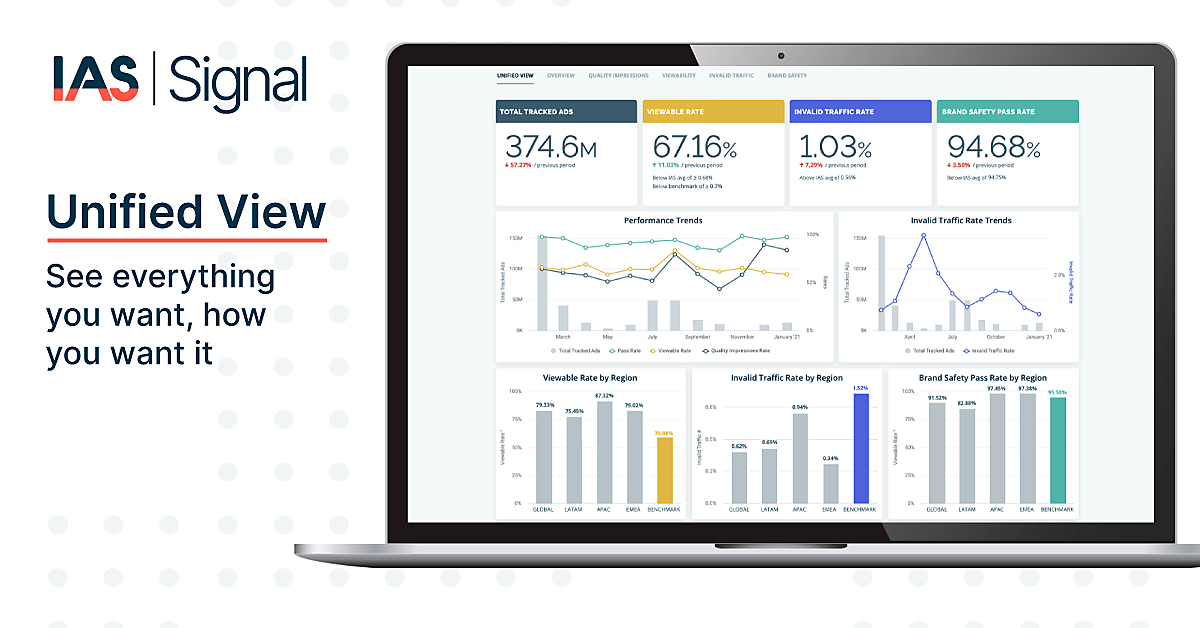 デジタル広告の検証・不正対策事業の米国Integral Ad Science(インテグラルアドサイエンス)=IAS=の日本法人は、統合レポート作成プラットフォーム「IAS Signal」(管理画面)のレポート機能を強化した、と4月6日に発表した。広告主は独自設定したキャンペーンのネーミング規則に基づいて自動作成されるカスタムフィルターによる「ユニファイドビュー」で、地域や商流、キャンペーンタイプでデータを切り取り分析できる。