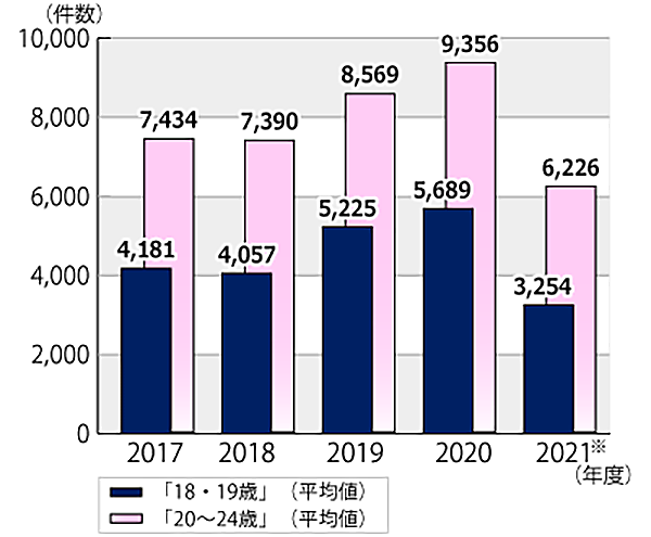 - 【相談件数の算出方法】契約当事者の年齢別に集計。「18・19歳」(平均値)は、18歳・19歳(2歳分)の相談件数合計を2で割った値。「20~24歳」(平均値)は、20歳~24歳(5歳分)の相談件数合計を5で割った値。平均値は、全て小数点以下第1位を四捨五入。