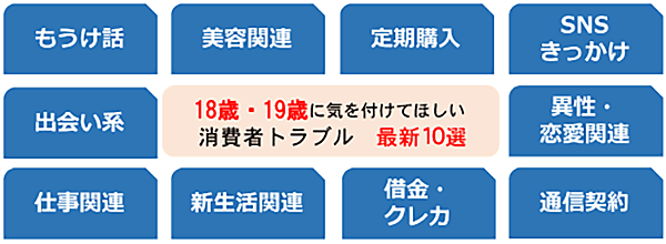 国民生活センターでは、「18歳・19歳に気を付けてほしい消費者トラブル」として以下の10項目をあげている。