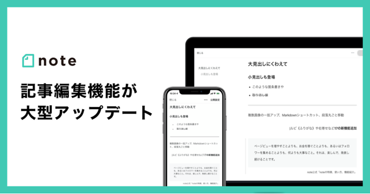 noteは文章や画像、音声、動画をクリエイターが投稿し、ユーザーがそれを楽しんで応援できるメディアプラットフォーム。2014年にサービスを始めた。記事編集機能は作品の発表に加え、自分用メモ、プレゼンテーションツール、草案を書き溜める場所などに活用されてきた。今回のアップデートで19の主要機能が追加され、利用用途がさらに広がった。