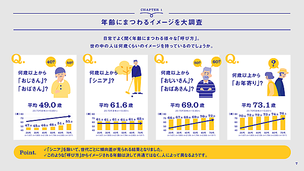 まず「おじさん/おばさん」「シニア」「おじいさん/おばあさん」「お年寄り」といった単語に対しイメージする年齢を聞くと平均値は、「おじさん/おばさん」49.0歳、「シニア」61.6歳、「おじいさん/おばあさん」69.0歳、「お年寄り」73.1歳だった。「シニア」と「お年寄り」ではイメージする年齢に11.5歳の差があった。