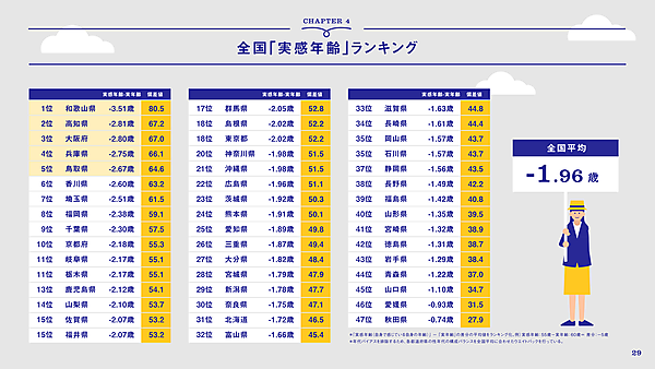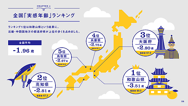 次に、「実際の年齢とは別に、自分自身で感じている自分の年齢」=「実感年齢」を、47都道府県別にランキング化したところ、もっとも自分を若く感じていたのは、「和歌山県」で実年齢からマイナス3.51歳が実感年齢だった。以下「高知県」マイナス2.81歳、「大阪府」マイナス2.80歳、「兵庫県」マイナス2.75歳、「鳥取県」マイナス2.67歳と、トップ5はすべて西日本エリアだった。なお全国平均は「マイナス1.96歳」で、もっとも差がなかったのは「秋田県」マイナス0.74歳だった。実感年齢が実年齢を上回った都道府県はない。