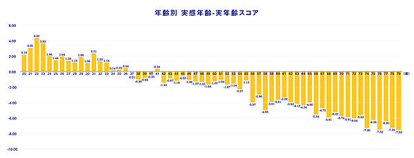 さらに「あなたはご自身の実感年齢を何歳と感じていますか」という質問において、「実感年齢」と「実年齢」の差を見ると、20代~30代は実年齢より実感年齢が高いが、ちょうど「37歳」で実年齢と実感年齢の関係が逆転し、40代以降は実年齢より実感年齢のほうが若くなることが判明した。