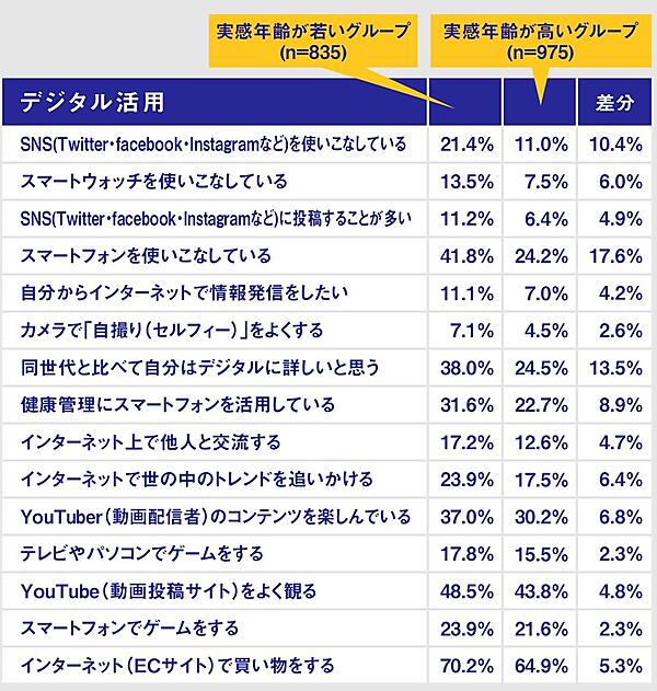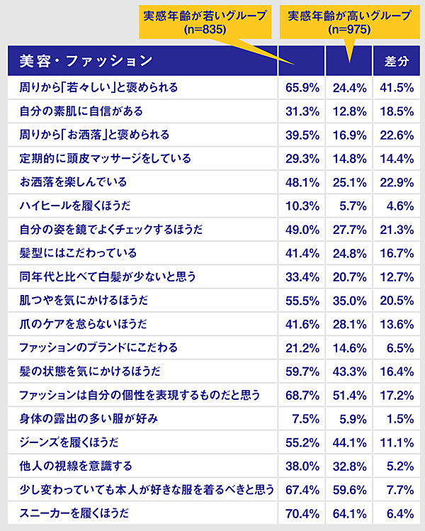 また実感年齢を実年齢より若く答える人たちは、「ファッションは自分の個性を表現するものだと思う」「自分の姿を鏡でよくチェックするほうだ」「髪型にはこだわっている」といった質問に対し、最大で21%以上高い数値を示した。「同世代と比べて自分はデジタルに詳しいと思う」「スマートフォンを使いこなしている」「SNS(Twitter・Facebook・Instagramなど)を使いこなしている」といった質問でも、10%以上高い数値を示している。