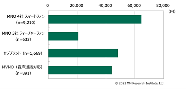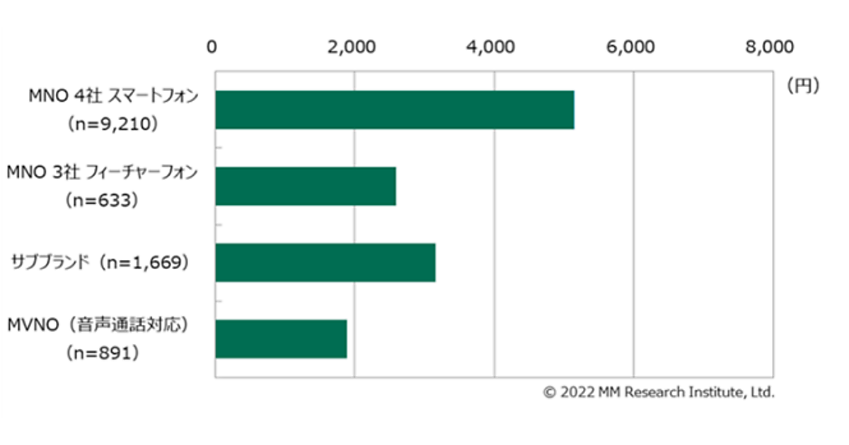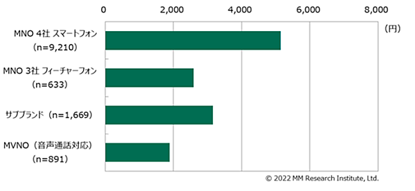 MM総研(MMRI)は、スマートフォン(フィーチャーフォン含む)の月額利用料金とサービス利用実態について調査した結果を発表した。「MNO」(NTTドコモ、au、ソフトバンク、楽天モバイルの4社)、「サブブランド」(ワイモバイル、UQモバイルの2つ)、「MVNO」の利用者にアンケートを実施し、約14,000人から回答を得ている。