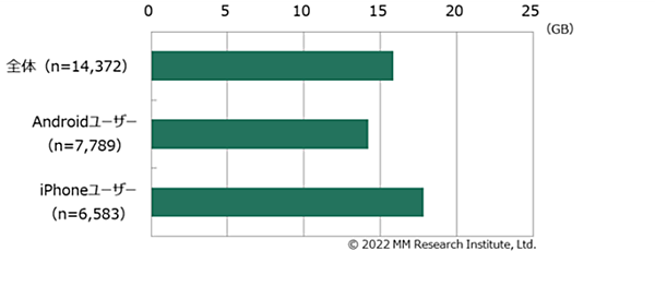 またスマートフォン利用者の「Wi-Fiデータ通信量」は、Androidユーザーで「14.22GB」、iPhoneユーザーで「17.84GB」と算出された。全体の平均は15.88GBとモバイルデータ通信量の倍近い。