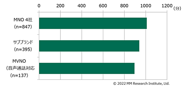 「1週間あたりのスマホ利用時間の全体平均は「979分」(16時間19分)。MNO 4社は「1,010分」、サブブランドは「940分」、MVNOは「895分」だった。
