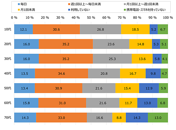 まず「スマホ・ケータイで音声通話する頻度」を聞くと、「毎日通話する」という人はすべての世代で10%台だった。年齢別でもっとも多いのは20代・30代(16%)で、60代(15.8%)がそれに続く。逆にもっとも少ないのは10代(12.1%)だった。「月1回以上」の頻度で見ると、若い世代ほど割合が多い。