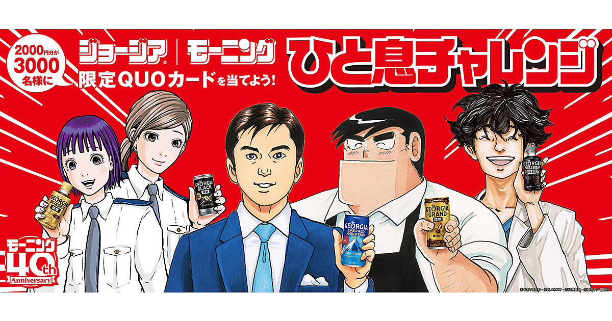 オリジナルデザインQUOカードが当たる「ジョージアひと息チャレンジ」キャンペーンも展開。コカ・コーラ公式スマートフォンアプリ「Coke ON」で「島耕作」「コウノドリ」「ハコヅメ~交番女子の逆襲~」「クッキングパパ」のオリジナルストーリー漫画を読み、ミニゲームなどのミッションクリアでレベルアップを繰り返してストーリーをクリアするとCoke ONスタンプが必ずもらえ、QUOカードが抽選で当たる。