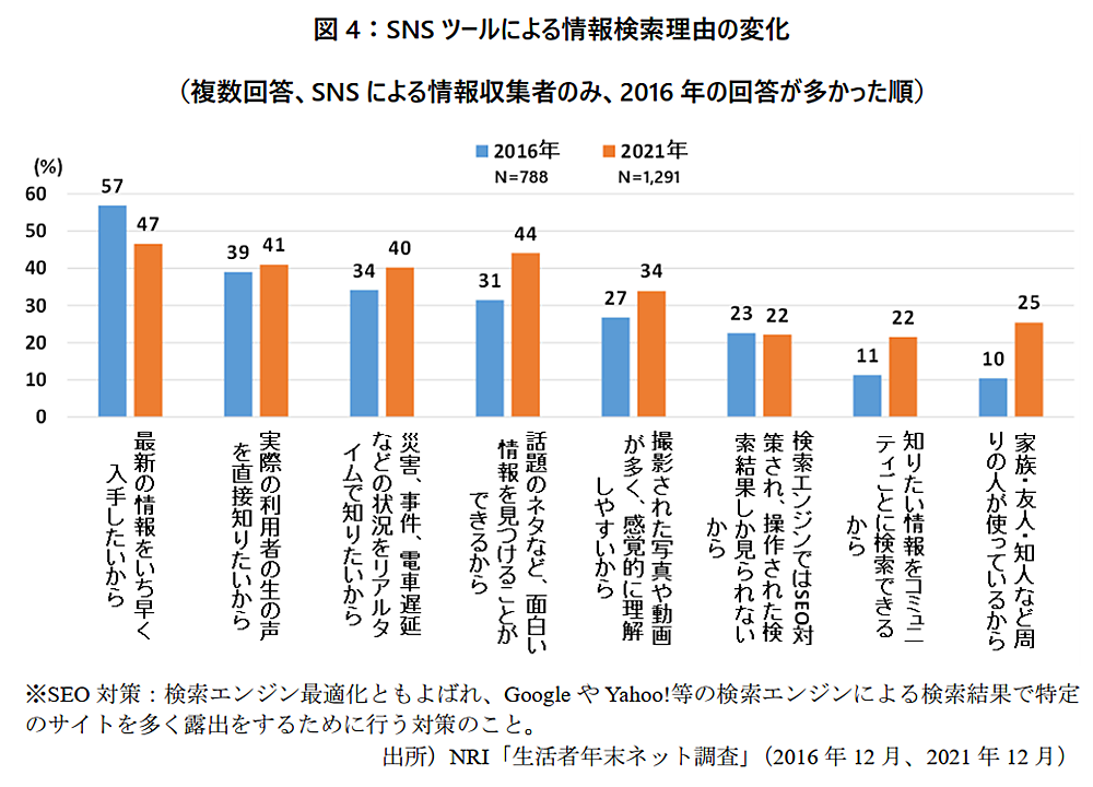 「SNSを情報収集に使う理由」を聞くと、最も多いのは2016年と同じく「最新の情報をいち早く入手したいから」47%だが、比率は減少している。