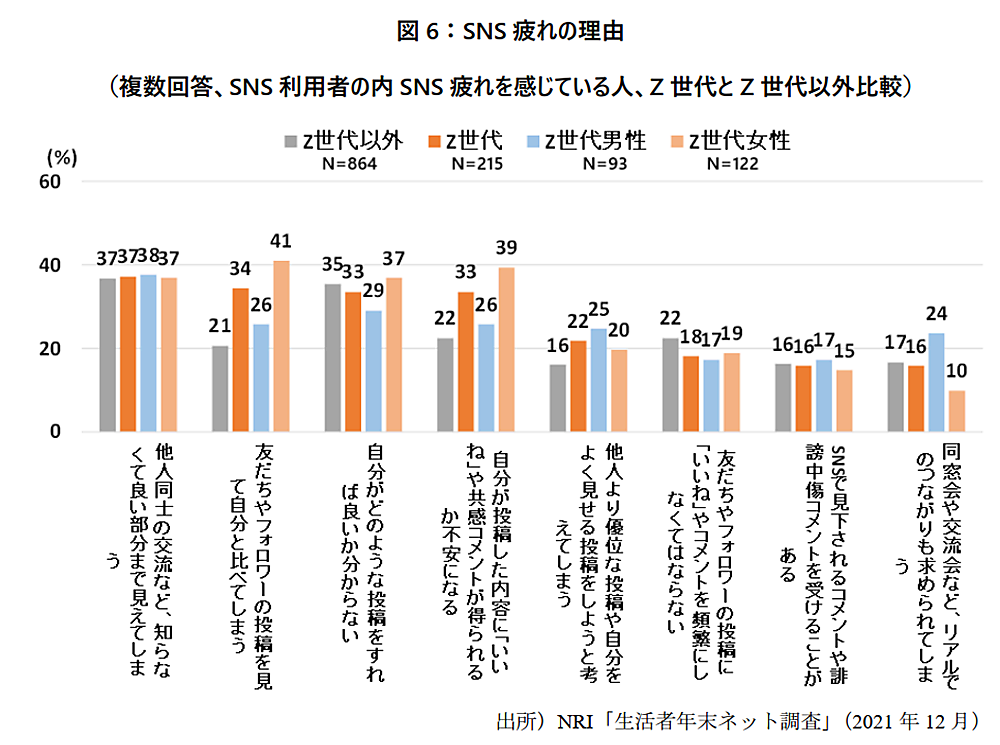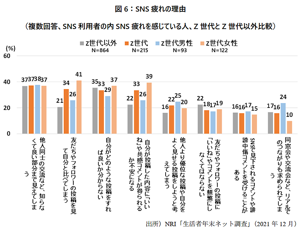 その理由を聞くと、Z世代は「友達やフォロワーの投稿を見て自分と見比べてしまう」34%、「自分が投稿した内容に『いいね』や共感コメントが得られるか不安になる」33%が多く、他人の目を気にしているようだ。一方「どのような投稿をすればいいかわからない」33%や「リアルでのつながりも求められてしまう」16%は少ない。