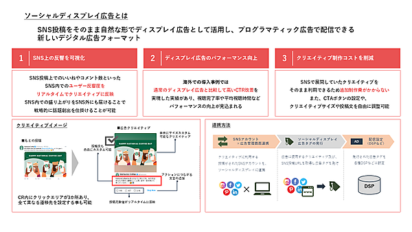 ソーシャルディスプレイ広告は、SNSの投稿を基にディスプレイ広告を自動生成する広告フォーマット。CCI Social AdTrimは、ソーシャルディスプレイ広告のフォーマットを創った広告技術企業の米国Spacebackの同広告を利用する。生成したクリエイティブはプログラマティック広告(運用型広告)で配信可能なため、より多くのユーザーをSNSに誘導できる。
