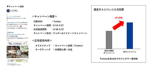 米国の事例だと、ソーシャルディスプレイ広告でリターゲティング広告の1.5倍、通常のディプレイ広告の2倍のCTR(クリック率)を記録したという。CCIは、はごろもフーズの協力を受け「Twitter」キャンペーンでソーシャルディスプレイ広告をテスト配信した。過去の類似キャンペーンと比べ、Twitter広告経由以外での新規フォロワー獲得数が63%増えた。