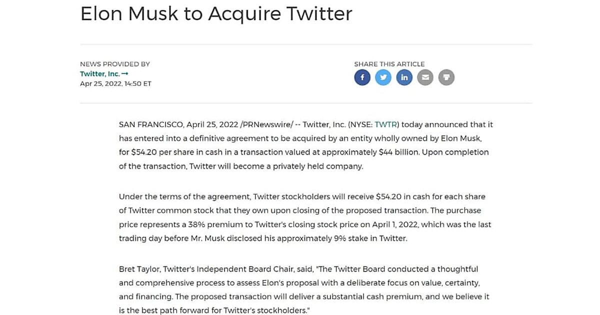 Twitterは25日(米国時間)、イーロン・マスク氏が保有する企業が同社を買収すると発表した。総額は約440億ドル(約5.6兆円)で、買収が完了すると、Twitterは株式非公開企業となる。買収完了は2022年中を予定している。