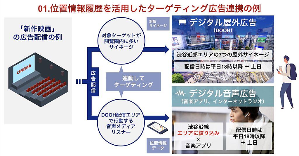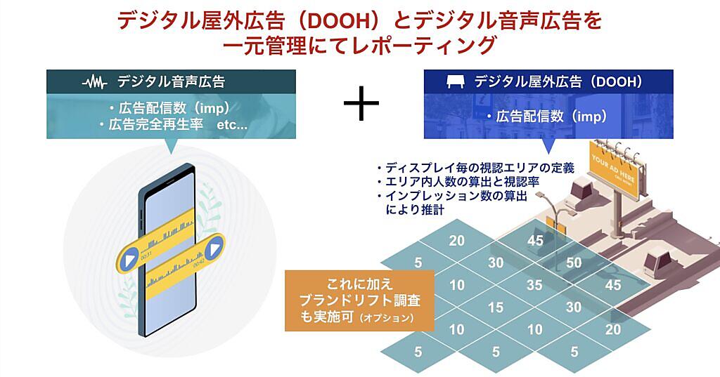 例えば①位置情報履歴を活用したターゲティング配信の連携②天候・気温・日時などシチュエーションに応じて再生する広告を連携・変化させた配信--が可能。①は新作映画のプロモーションなど、②はケータリングサービスのプロモーションなどを想定する。DOOHとデジタル音声広告を一元管理してレポートし、効果の定量的な「見える化」もできる。
