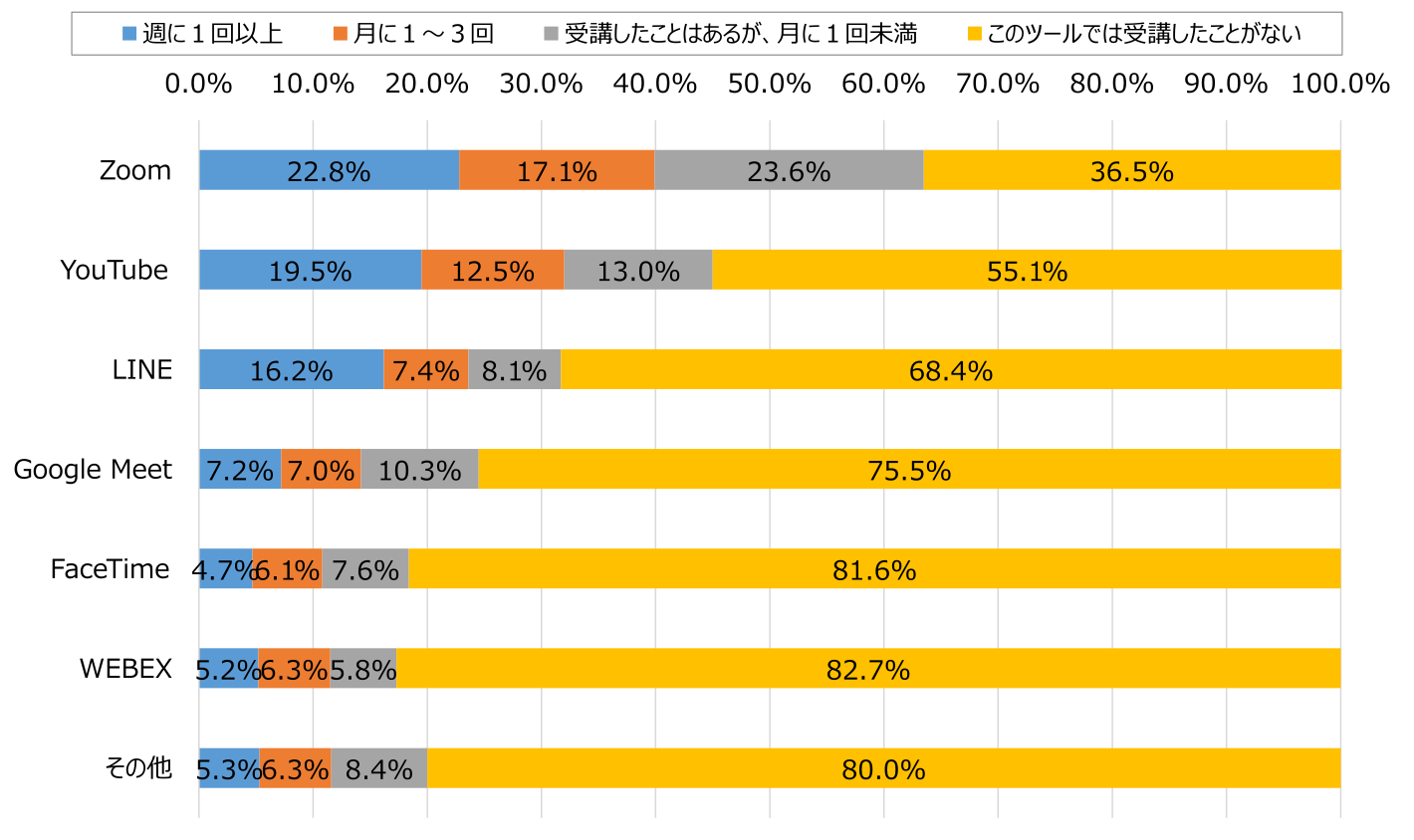 次に「利用するツールと頻度」を聞くと、「Zoom」63.5%の利用経験者が最多で、「YouTube」44.9%、「LINE」31.6%がそれに続いた。いわゆるEラーニング系ツールより、汎用的なサービスが利用されているようだ。また上位3サービスはかなり機能が異なっており、質疑応答が多いか、受講型か、動画が必須かといった部分で使い分けがされていると考えられる。