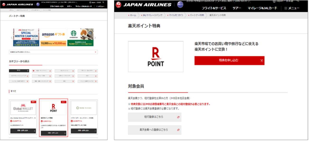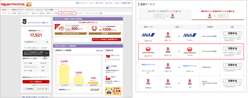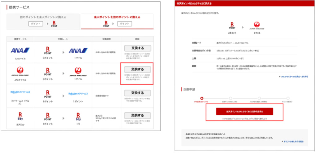 楽天ポイントの2ポイントをJALマイルの1マイルに交換できる。最小50ポイントから2ポイント単位で設定でき、1カ月最大2万ポイントまでJALマイルに交換可能。JALマイルから楽天ポイントへの交換は最小3000マイルからで、3000マイル以上1000マイル単位ならJALマイルの1マイルを楽天ポイントの0.5ポイントに交換できる。1万マイル以上を1万マイル単位なら、JALマイルの1マイルを楽天ポイントの0.8ポイントに交換できる。